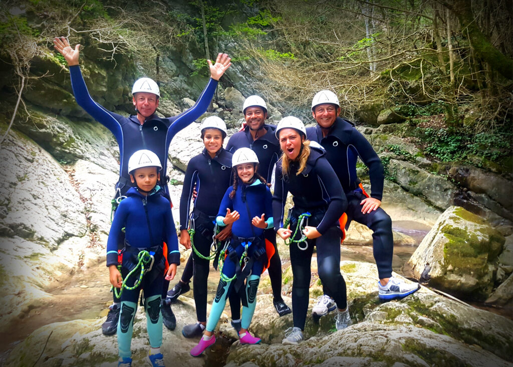 Nous avons pu constater que nos sorties de canyoning en famille permettait de renforcer la confiance et l’autonomie des enfants. Nous voyons souvent des enfants un peu hésitants au départ repartir avec un grand sourire. Les parents aussi.